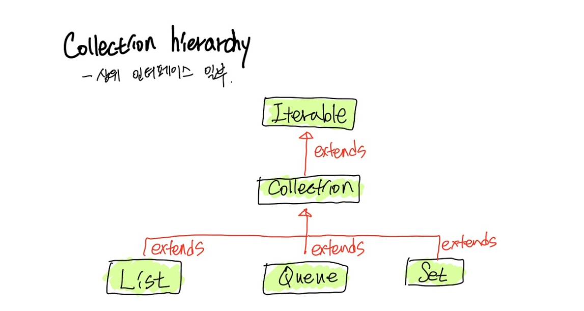 public interface Collection<E> extends Iterable<E> { // ... }그런데, Iterable 을 확장하고 있다.. 역시나 순서를 잘못 잡은 듯 하다.