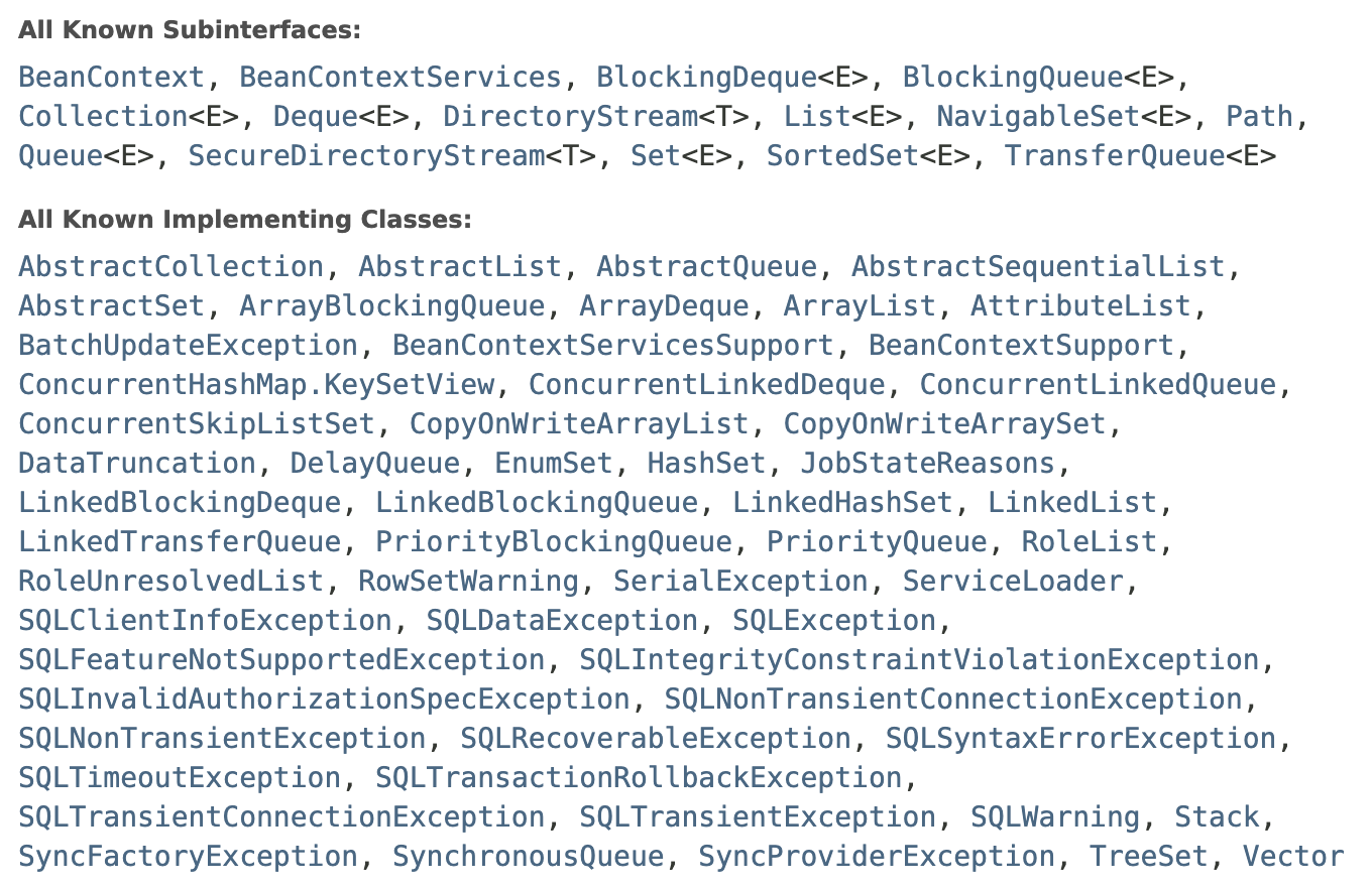 Iterable을 확장한 SubInterface 들과 잘 알려진 구현 클래스들이 나열되어 있다.