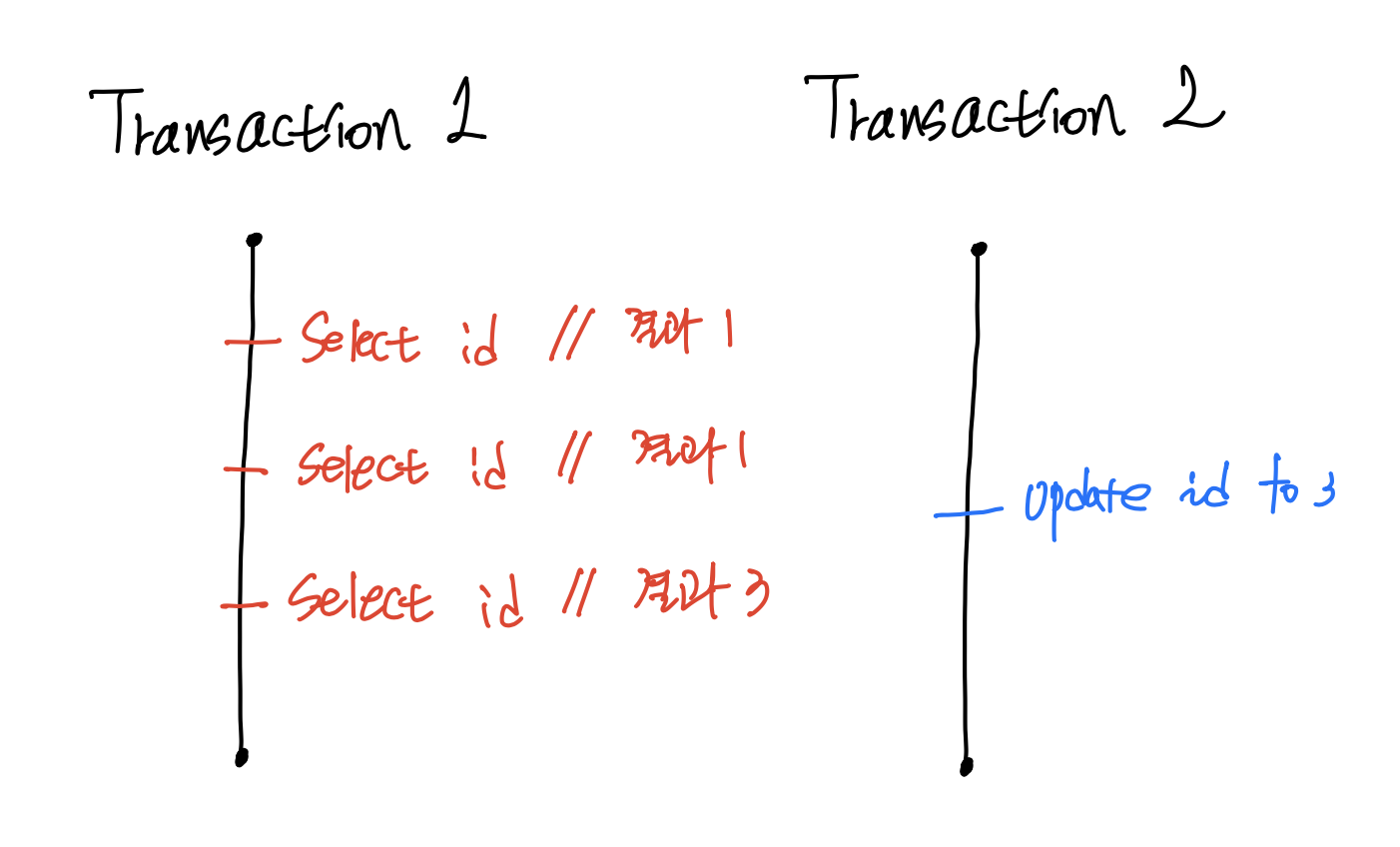 여기서 한 가지 문제점이 발생할 수 있다. 만약 하나의 Transaction 내에서 여러개의 SELECT 쿼리가 실행되었다고 해보자. 그렇다면 실행된 각각의 SELECT 쿼리는 쿼리가 실행되기 전 마지막 커밋된 데이터의 스냅샷을 읽어오기 때문에, 다른 결과를 보여줄 수 있다.