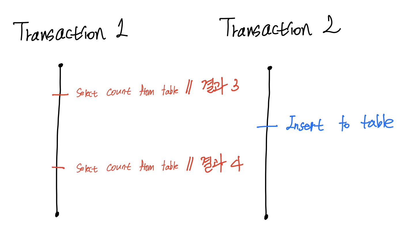 Transaction 1 이 단일한 검색 조건을 사용하였고, 그에 대한 결과가 다른 Transaction 내에서 실행되는 INSERT 에 의해서 결과가 달라지는 경우를 PHANTOM READ 라고 한다.