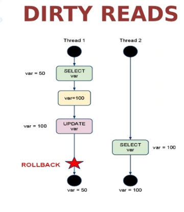 따라서 var = 100 데이터를 가지고 올 수 있다. 그런데 여기서 Tread 1 에서 실행했던 Transaction 이 commit (종료) 되지 않고, roll back 되었다면 var 는 100 이 아니라 초기의 값인 50 으로 되돌아 간다.
