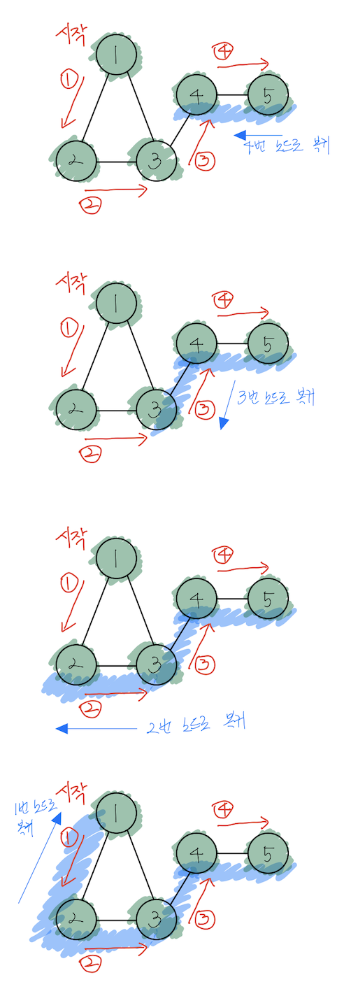 5번 노드까지 탐색 완료 후, 더 이상 간선으로 연결된 노드가 없다면 이전 노드인 4번 노드로 복귀한다.