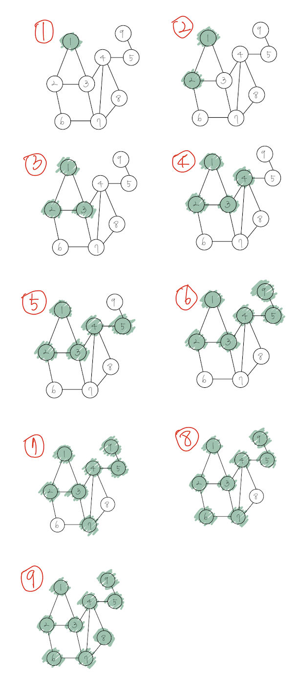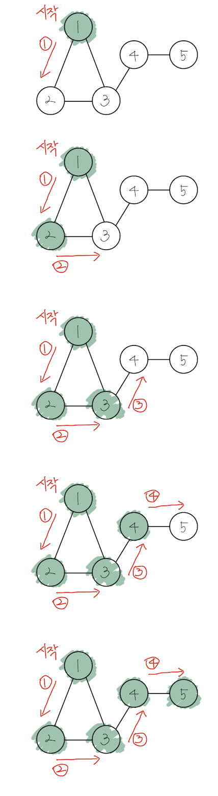 위에서 깊이를 우선으로 탐색을 이어나가는 과정을 살펴보았다.
