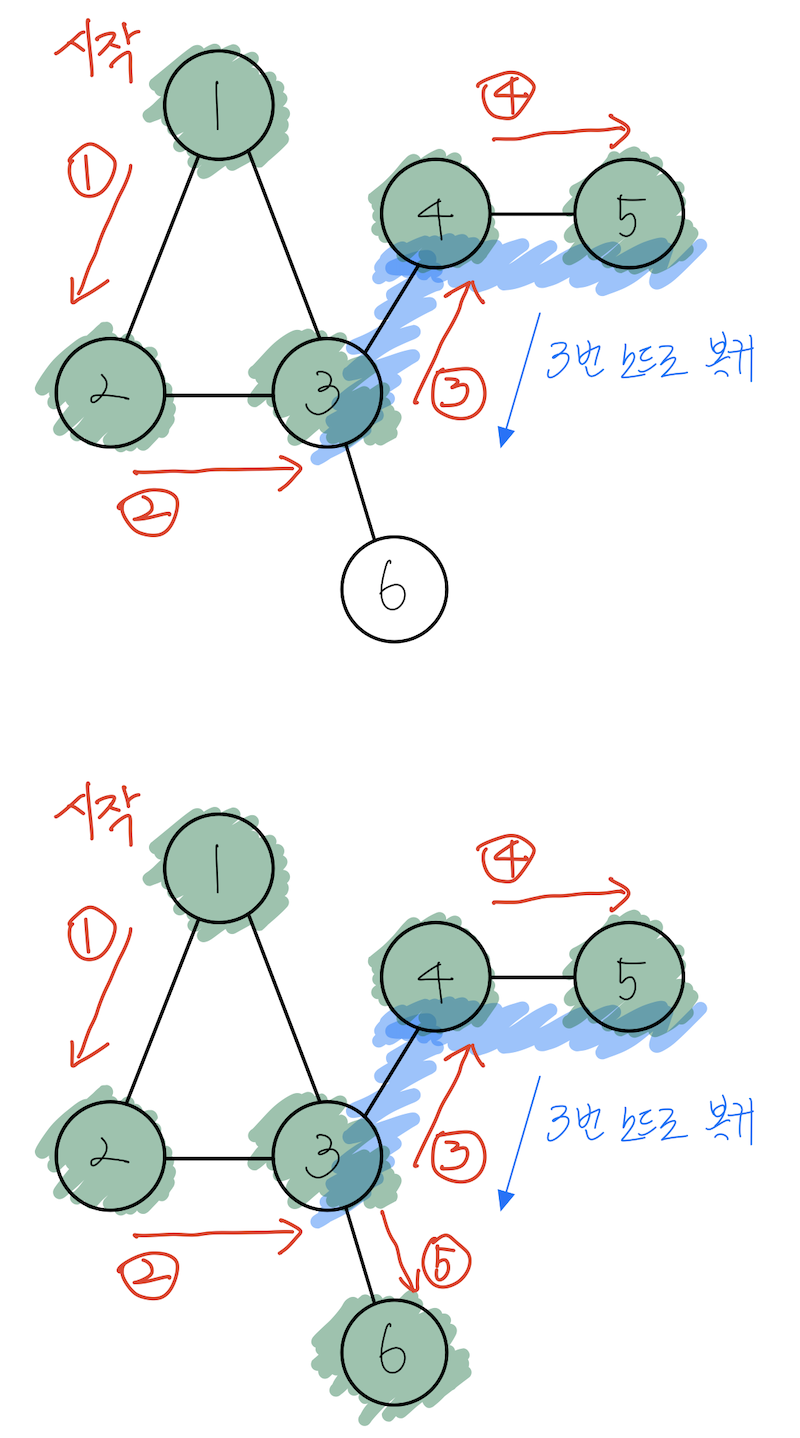 3번 노드로 복귀하고 보니, 간선으로 연결된 6번 노드가 존재한다.