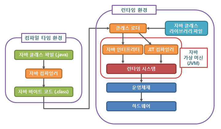 - JIT 컴파일러 (Just-In-Time Compiler) : 인터프리터의 단점을 보완하기 위해 도입된 방식으로 바이트 코드 전체를 컴파일하여 바이너리 코드로 변경하고 이후에는 해당 메서드를 더 이상 해석하지 않고, 바이너리 코드로 직접 실행하는 방식이다. 바이트 코드를 한번에 컴파일 하기 때문에 컴파일 시간은 늘어나지만 전체 실행속도는 인터프리팅 방식보다 빠르다.