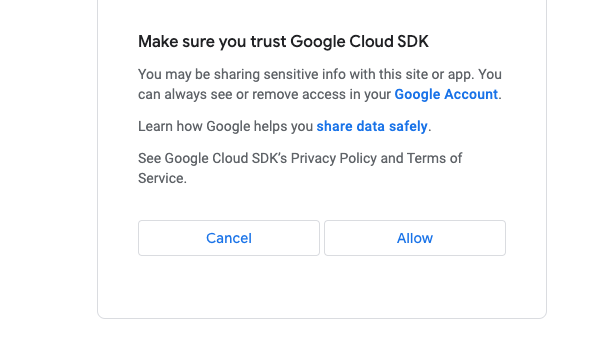 $ gcloud auth login --remote-bootstrap="https://accounts.google.com/o/oauth2/auth?response_type=code&client_id=........."입력하고 나면 구글 로그인 창이 브라우저로 실행된다.